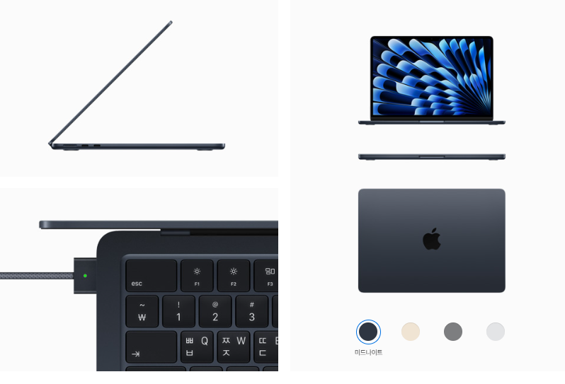 맥북에어 M2 15인치는 13인치와 크게 다르지 않은 스펙에 화면이 커졌다. 두께는 11.5mm로 에어라는 이름답게 얇은 두께를 지니고 있어 세상에서 가장 얇은 15인치 노트북이다.